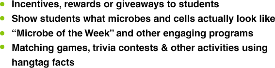 "I love the microbes. I have made it a weekly lesson for kids called Microbe Monday. I made 1-page fact sheets that I give the kids and then I hang the microbes from the ceiling. The kids love it. Tangential science."