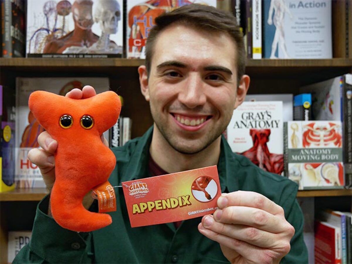 The appendix is a finger-shaped tube sticking out of your colon. It is often considered a “joke organ” with no function. Learn all about this organ with our adorable GIANTmicrobes Appendix plush. Educational, fun and provides emotional support if you are going through the pain of appendicitis.