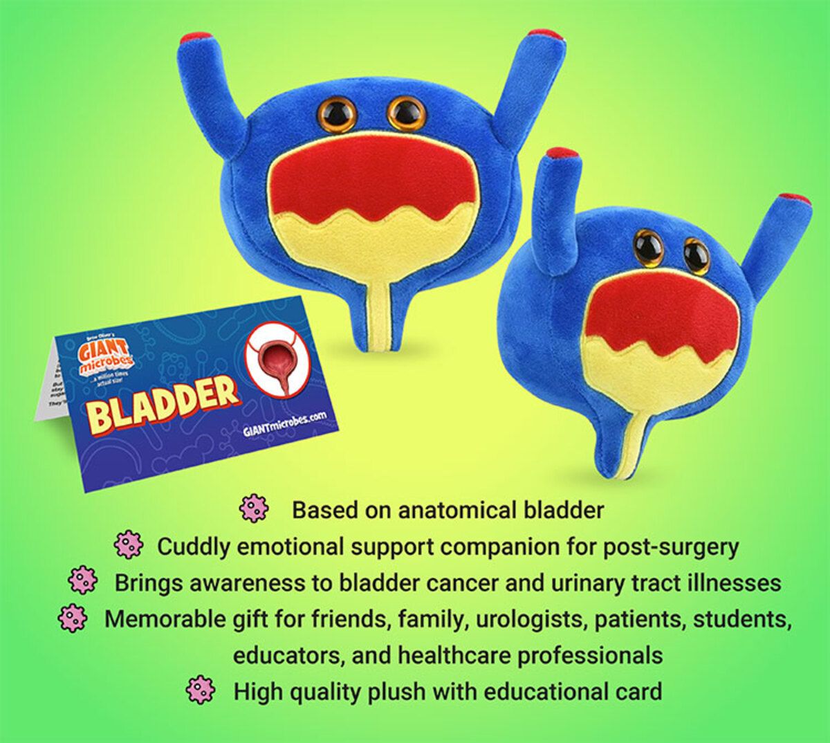 Urine for a treat! This adorable plush representation of a bladder provides a fun hands-on way to learn about your urinary system, anatomy, biology and health.GIANTmicrobes Bladder is soft, cuddly and makes a memorable get well gift for loved ones post-surgery or with bladder issue. Give good feelings to those dealing with UTIs and other bladder infections. Also, a great potty training educational toy. Unique gift for family, friends, scientists, doctors, students, teacher, public health experts and anyone with a healthy sense of humor.
