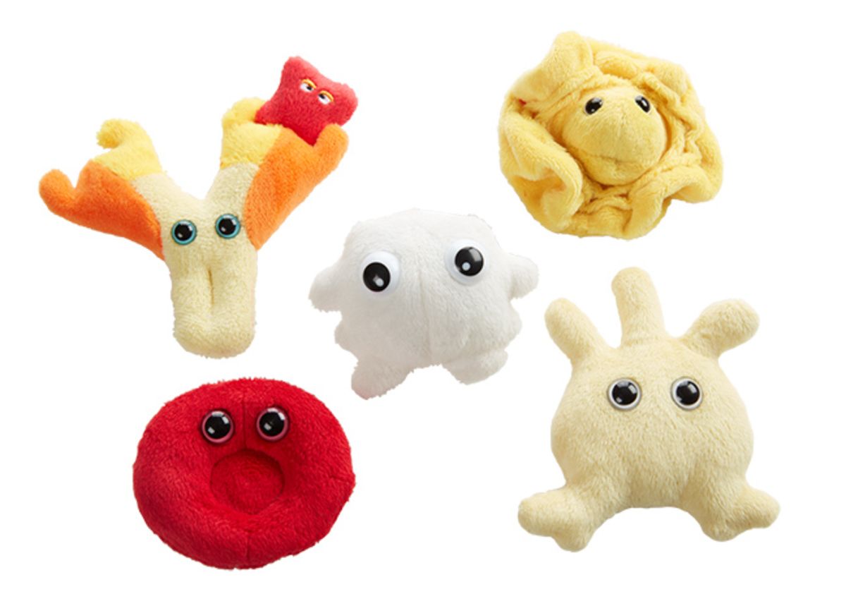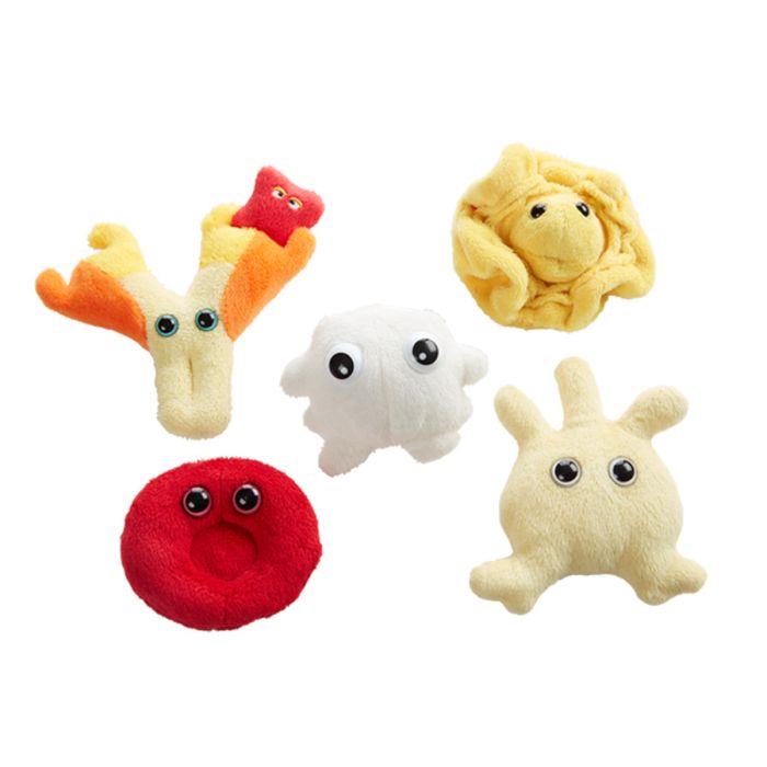 Blood Cells themed gift box includes these mini microbes: Red Blood Cell, White Blood Cell, Plasma, Platelet, and Antibody.