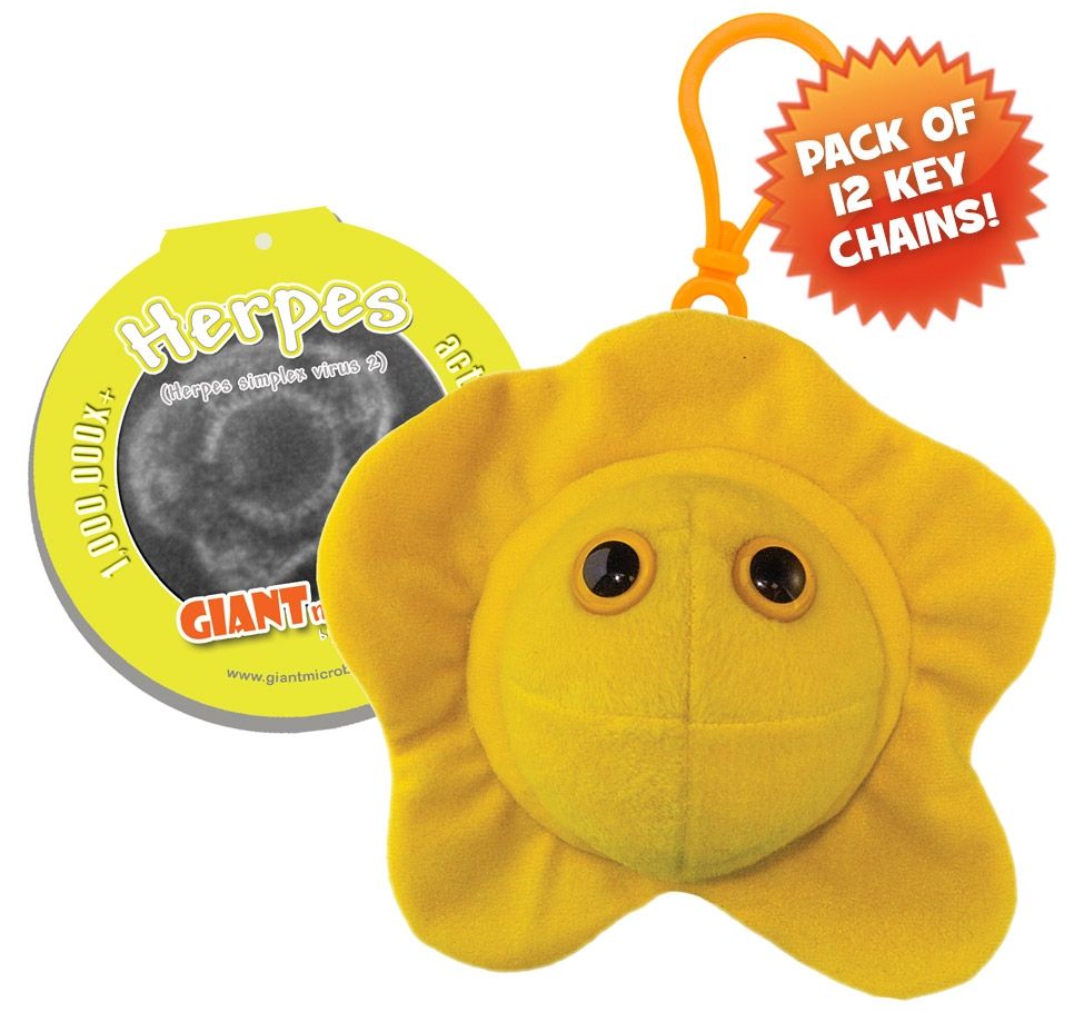 Pack of 12 Herpes mini microbes (8cm) with mini-tag and key ring clip.