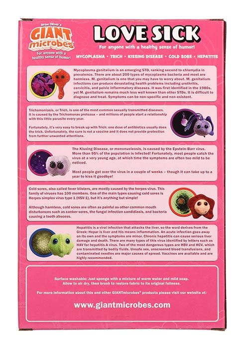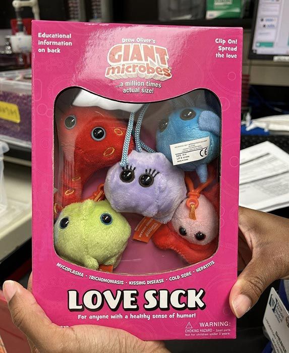 Love Sick themed gift box includes these mini microbe key chains: Mycoplasma, Trichomoniasis, Kissing Disease, Cold Sore and Hepatitis.