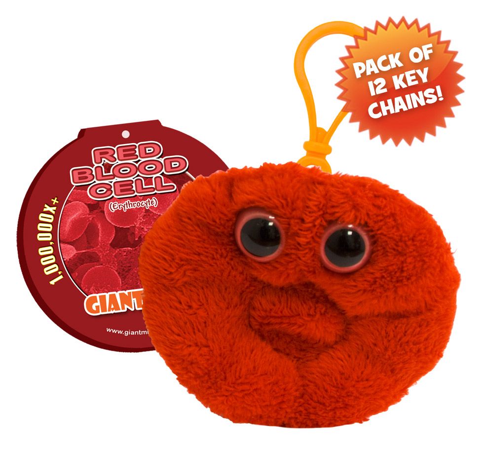 Pack of 12 Red Blood Cell mini microbes (8cm) with mini-tag and key ring clip.