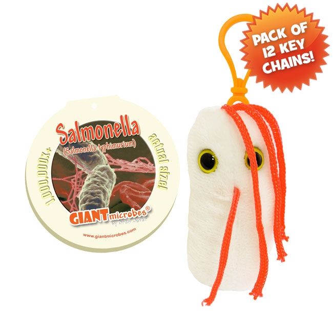 Pack of 12 Salmonella mini microbes (8cm) with mini-tag and key chain clip.