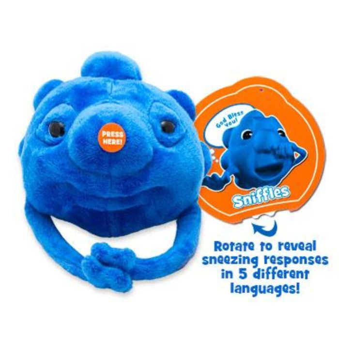 Our sound doll Sniffles(R) sneezes when you squeeze his nose!