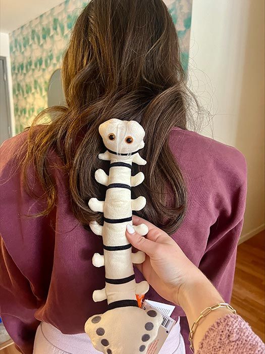 GIANTmicrobes plush Spine features 7 vertebrae representing the vertebral column with dark grey discs in between. At the bottom is the sacrum and coccyx, or tailbone, with detailed grey embroidery.