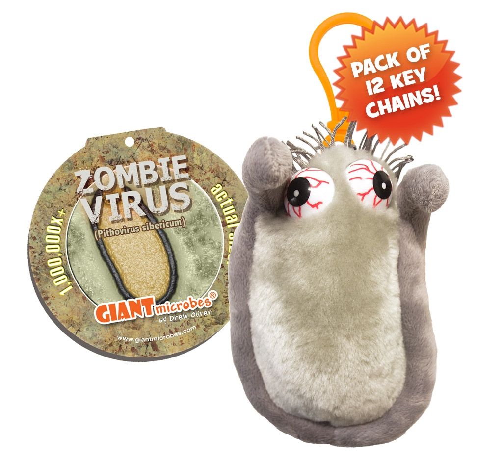 Pack of 12 Zombie Virus mini microbes (8cm) with mini-tag and key chain clip.