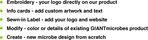 For qualifying orders, we can design a completely new plushie from scratch. You may use one of our signature GIANTmicrobes products as a starting point or send us your new concept. Working with your design team, you will be able to make a few rounds of changes, and then see a photograph or physical sample before we begin production. These new designs will be aesthetically designed and branded to meet your specific timeline, discount, margin goals and other requirements.