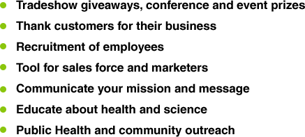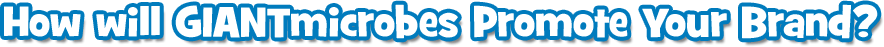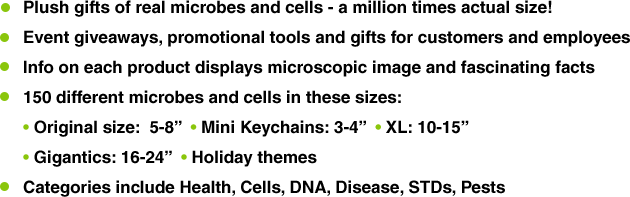 These custom branded GIANTmicrobes plushies are our most popular option for promotions, tradeshows, sales events and other marketing campaigns. We will namedrop, use your logo, contact information, marketing message and add any branded artwork you would like. Select any product from our catalog, and we will add your artwork and information to the permanently attached sewn-in tush tags. Options include: embroider your name or logo on the plushie surface fabric and print our hangtag cards with your logo, artwork and marketing message on the cards (300 words of written copy will fit). This requires new production at our overseas factory, so it takes more time. Select from our active catalog of over 300 GIANTmicrobes products or product designs from our back catalog.