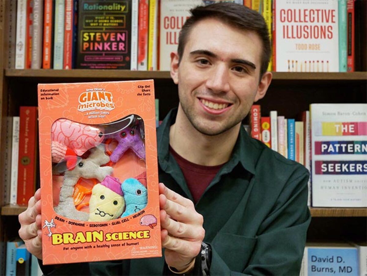 Brain Science themed gift box includes these 3" mini microbe key chains: Brain, Dopamine, Serotonin, Glial Cell and Neuron. Educational information on back.