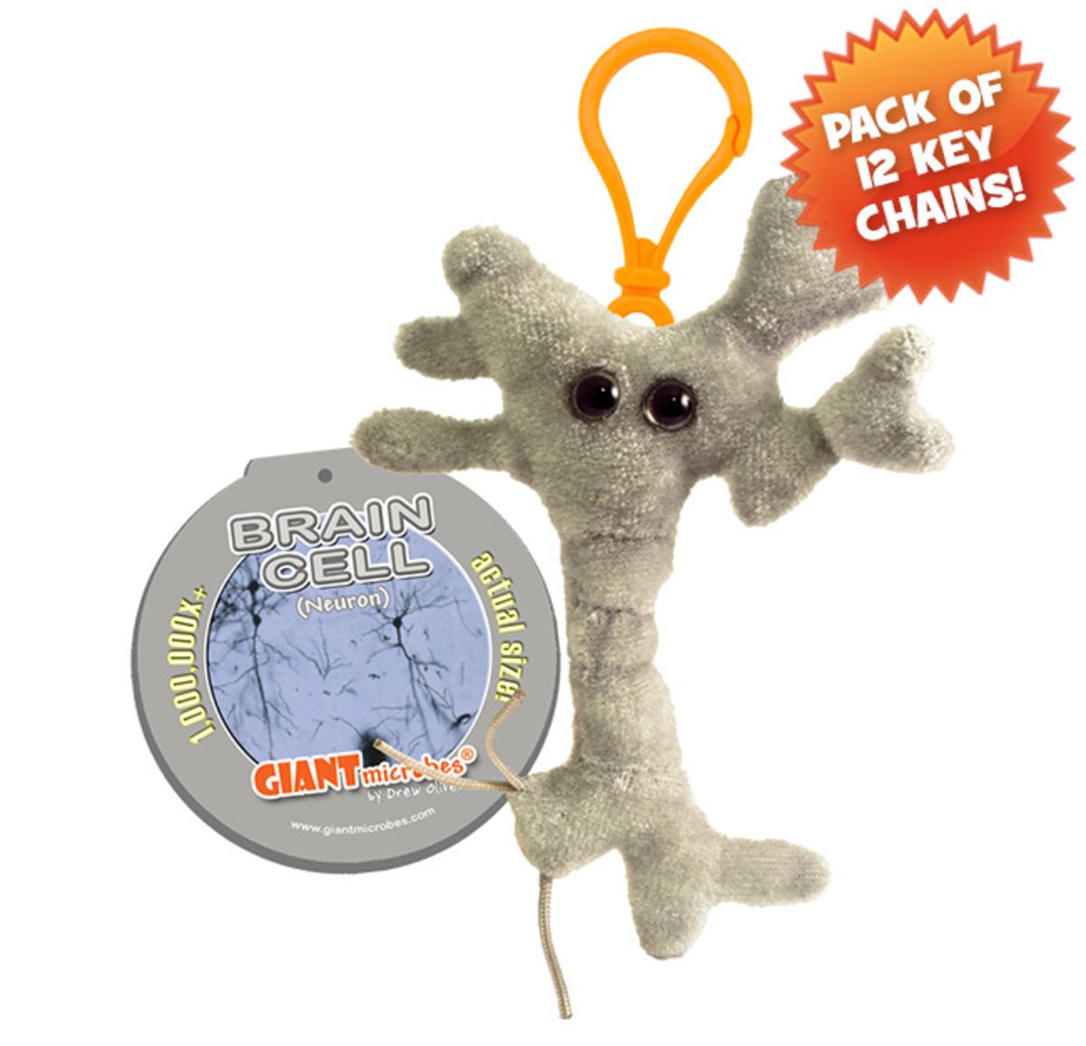Pack of 12 Brain Cell mini microbes (3.5") with mini-tag and key chain clip.