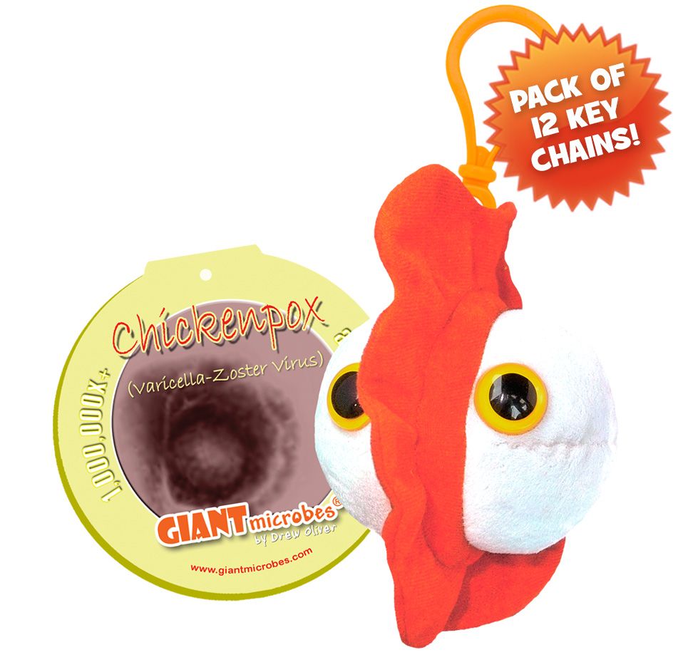 Pack of 12 Chickenpox mini microbes (3") with mini-tag and key chain clip.