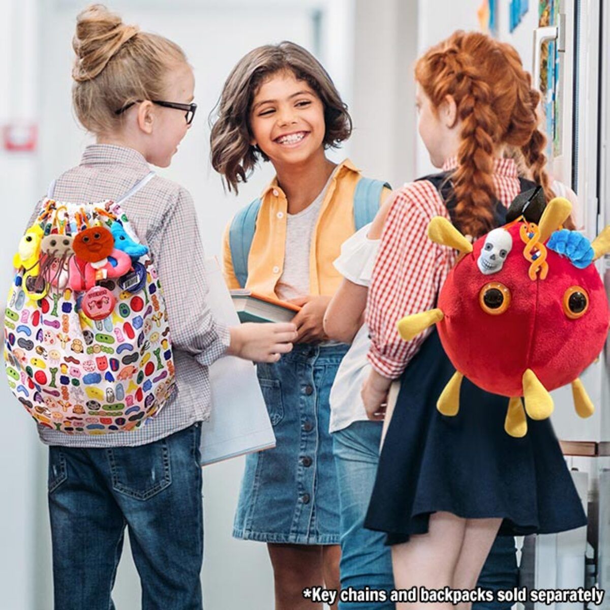 Holds 4 regular size or 12 key chain size GIANTmicrobes. Includes adjustable straps and storage compartment with zipper closure.