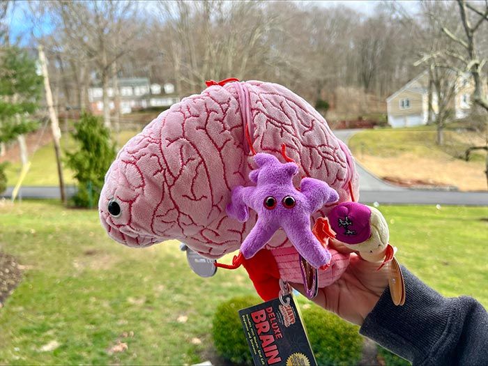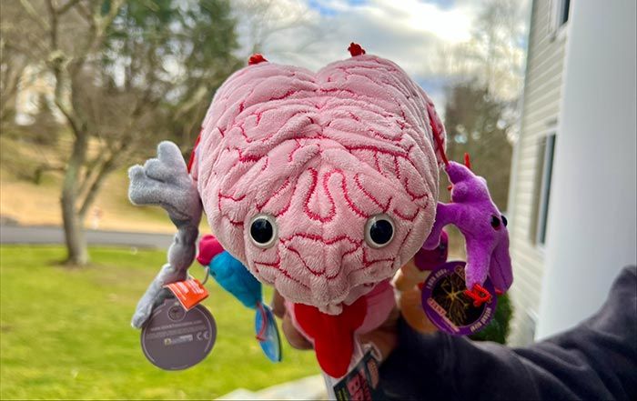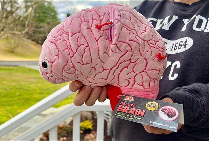 Features giant deluxe brain with zippered pockets that hide and contain 4 plush 3" GIANTmicrobes: Neuron, Glial Cell, Dopamine and Serotonin.