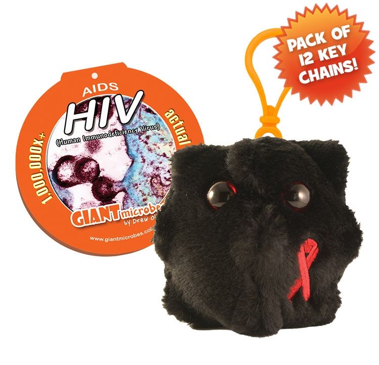 Pack of 12 HIV mini microbes (3") with mini-tag and key chain clip.