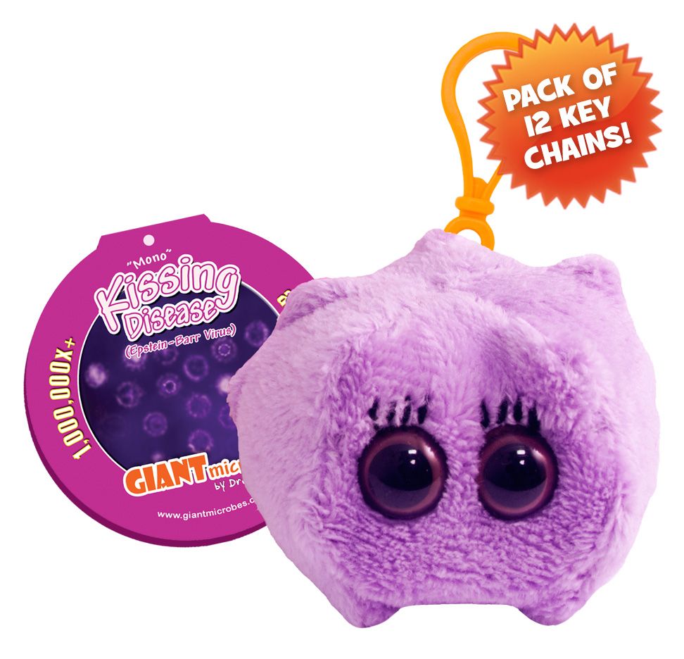 Pack of 12 Kissing Disease mini microbes (3") with mini-tag and key chain clip.