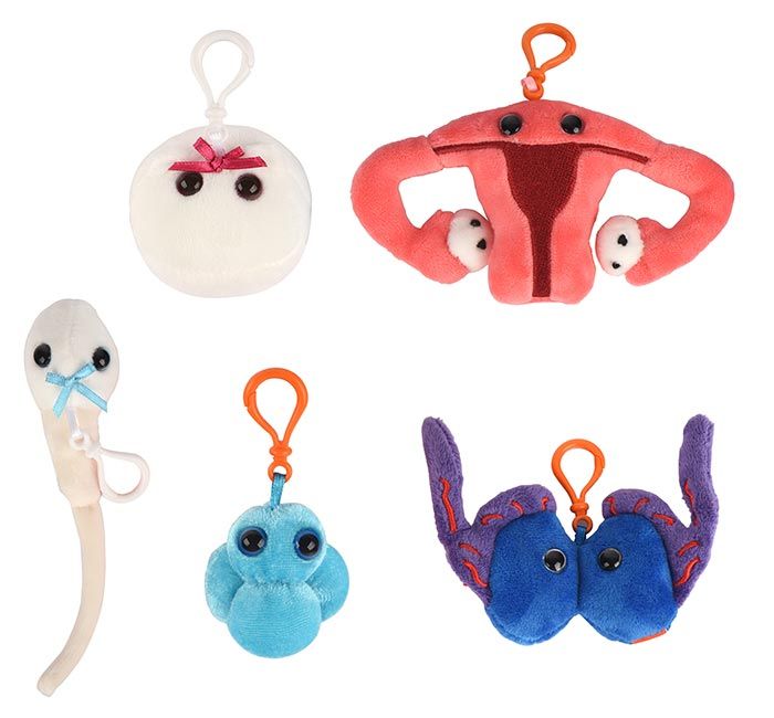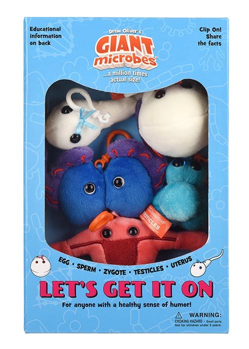 Let's Get It On themed gift box includes these mini microbes: Egg Cell, Sperm Cell, Zygote, Testicles and Uterus.