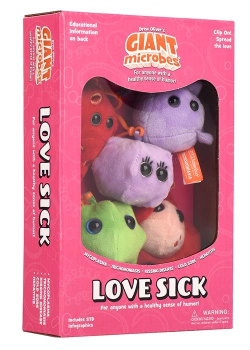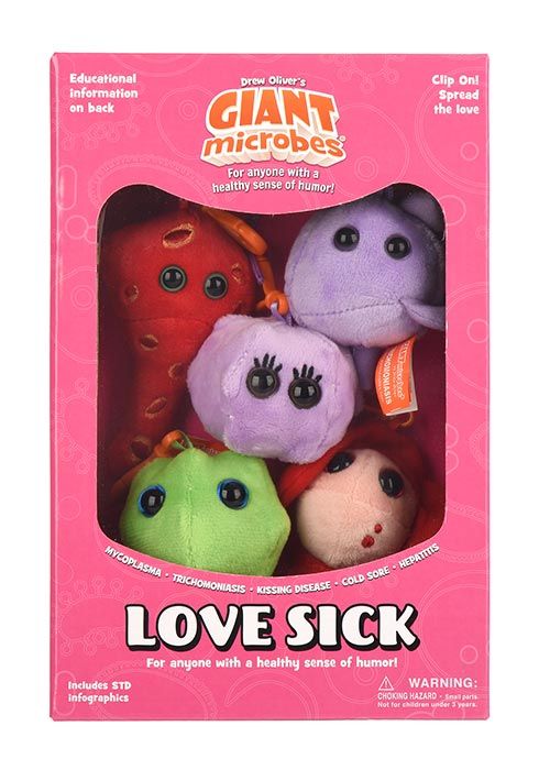 Love Sick themed gift box includes these mini microbe key chains: Mycoplasma, Trichomoniasis, Kissing Disease, Cold Sore and Hepatitis.