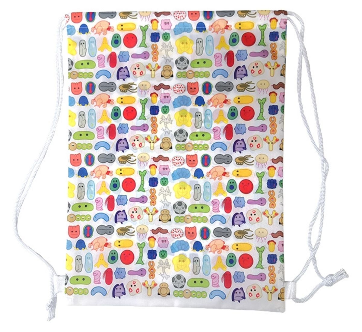 High-quality durable nylon drawstring pack is printed with artwork of dozens of colorful microbes! Accessorize and travel in biological style with this fun gift for family, friends, scientists, students, teachers, healthcare workers, microbe lovers and anyone interested in health and science.