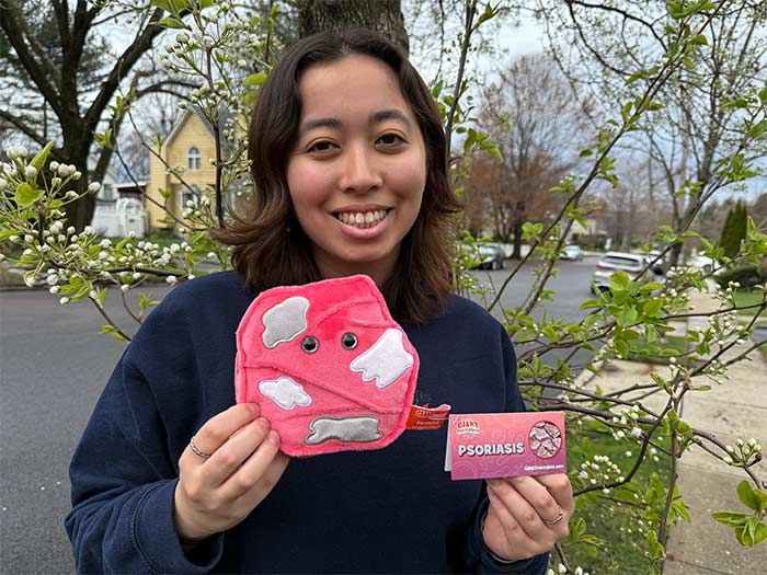 Our Psoriasis plush brings skin health to life with a design based on real skin cells affected by psoriasis. Featuring soft plush with textured dry patches, it's a unique way to explore this autoimmune condition and its impact on the body.