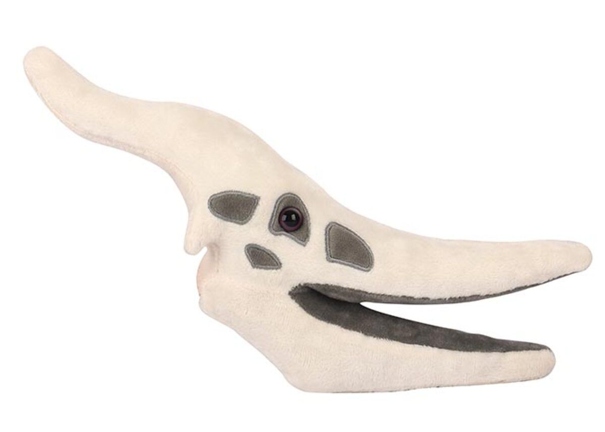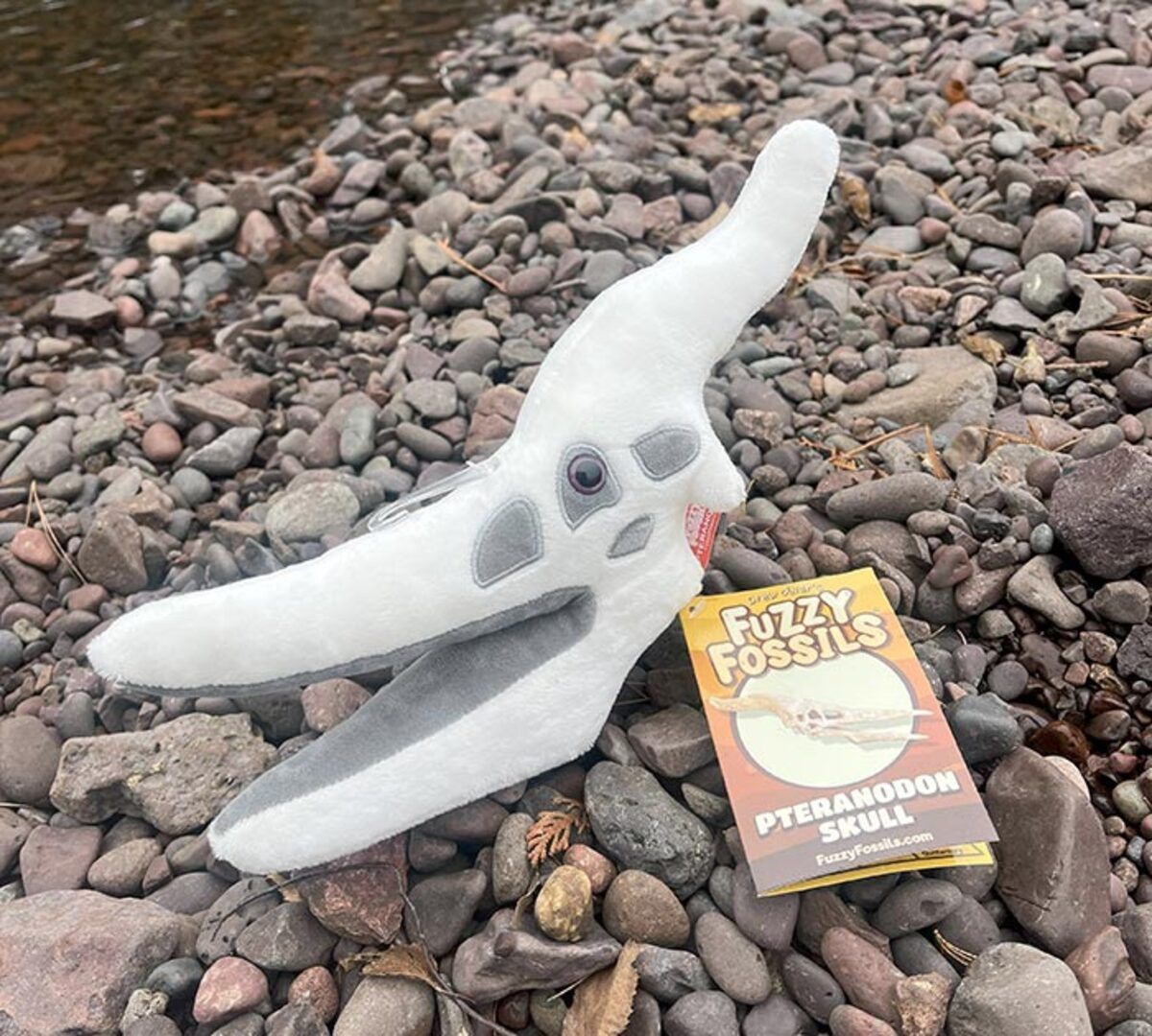 Pteranodon flew over the shallow seas hunting fish 70 to 65 million years ago. This remarkable reptile was well adapted for fishing with its 30-foot wingspan, long toothless jaw and streamlined skull ideal for diving into the water. Its triangular skull crest pointed backwards and its wings were formed by skin stretched over elongated fingers. The name pteranodon means “wings no teeth.”