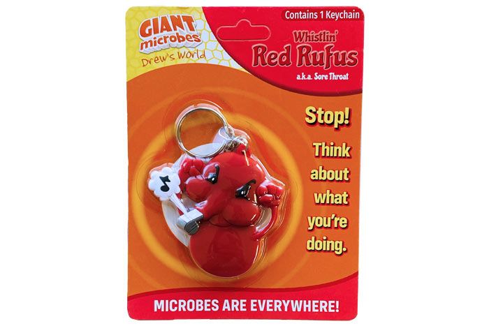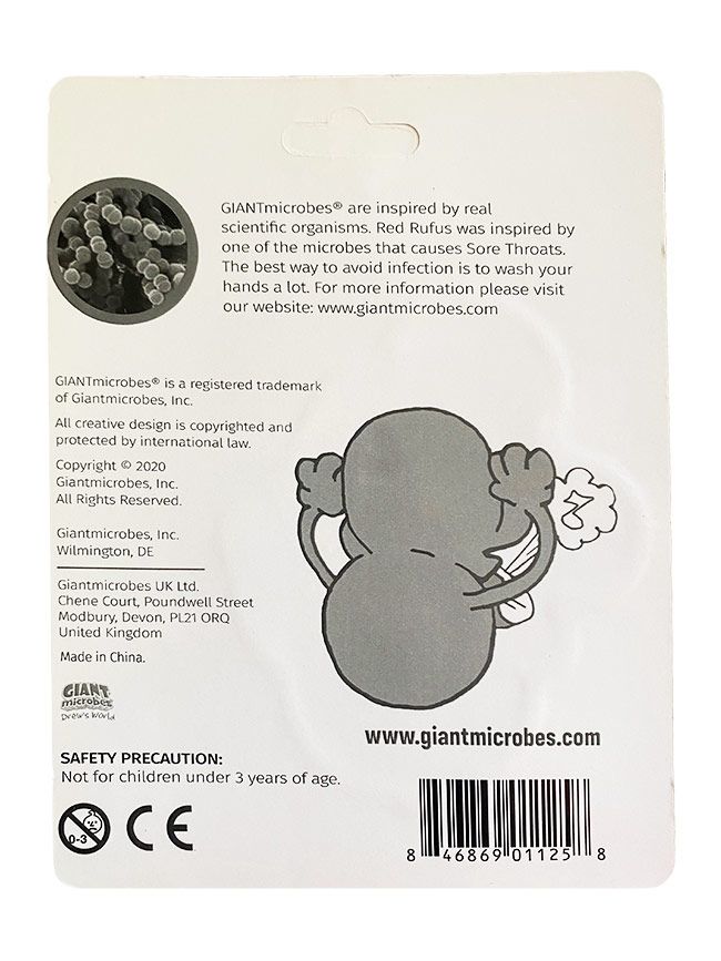 GIANTmicrobes are inspired by real scientific organisms. Whistlin' Red Rufus was inspired by one of the microbes that causes the Sore Throat. The best way to avoid infection is to wash your hands a lot.