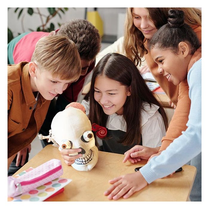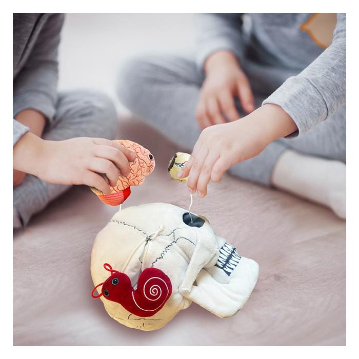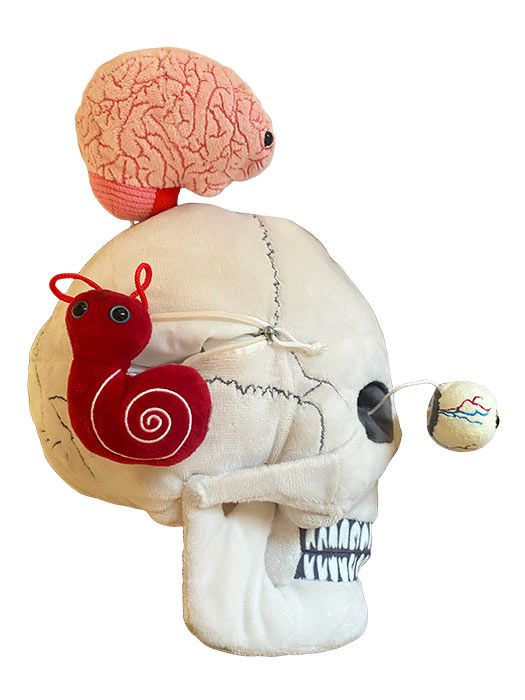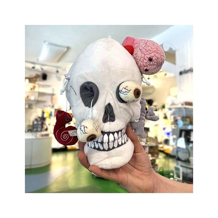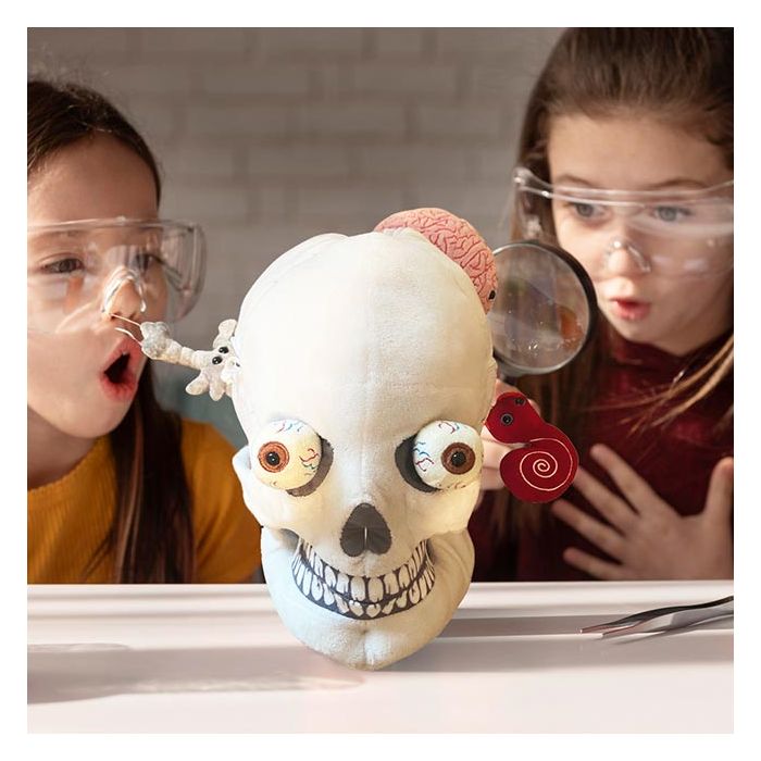 Includes deluxe size Skull with removable Brain, Inner Ear and Brain Cell hidden inside zippered pockets plus two removable pop-out Eyeballs.