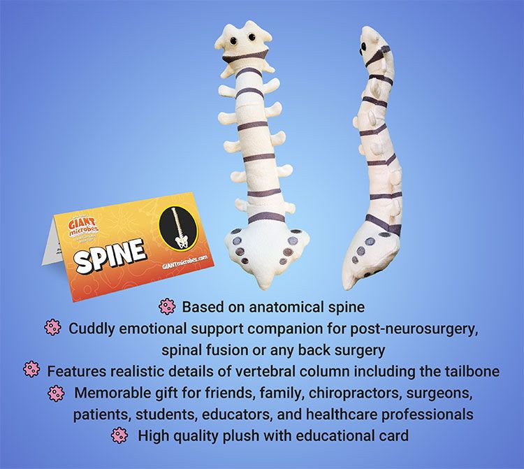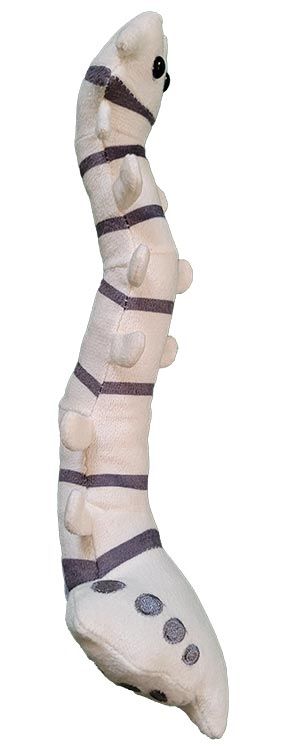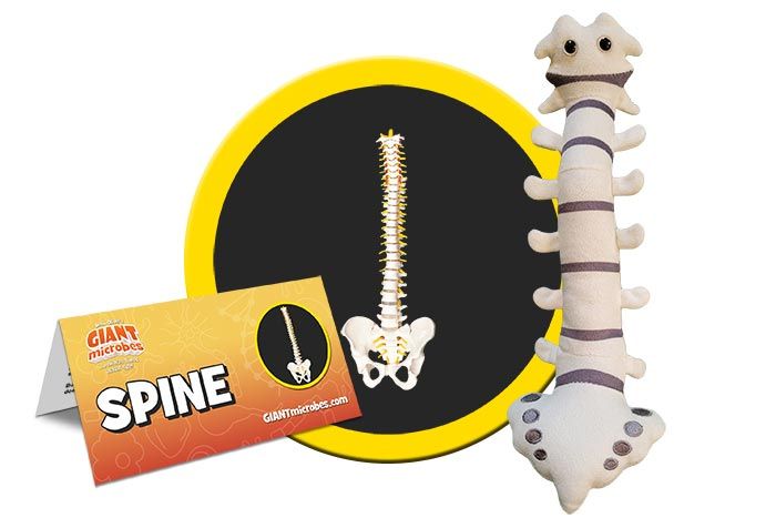 GIANTmicrobes plush Spine features 7 vertebrae representing the vertebral column with dark grey discs in between. At the bottom is the sacrum and coccyx, or tailbone, with detailed grey embroidery.
