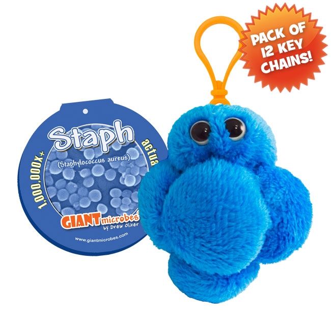 GIANTmicrobes adorable plush Staph is a popular teaching tool in hospitals. Better hygiene reduces nosocomial transmissions and a good reminder to treat cuts with antibiotic ointment quickly.