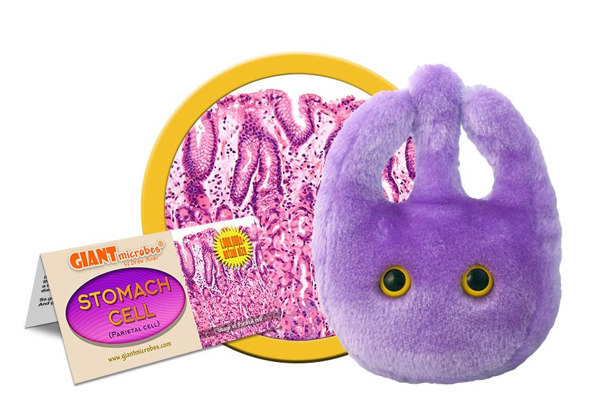 FACTS: The stomach receives, holds and partly digests food. This pouch-like organ is actually small, but as you eat the stomach wall quickly stretches to hold up to 3/4 gallon or 3 liters. It churns and mixes food with acids and enzymes. The powerful muscles lining the stomach mash food, breaking up fats and proteins. Orange juice… how about some stomach juice?! When you see or smell food, tiny stomach glands secrete gastric juice. This stomach juice is mostly hydrochloric acid with a touch of the enzyme pepsin that digests proteins. The acid activates pepsin, breaks down food, and also kills germs. Your stomach produces up to 3 liters of gastric juice every day. Mucous cells that line the stomach protect it from the acid, so that the stomach doesn’t digest itself!