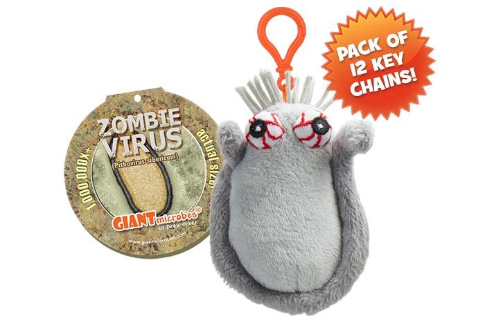 Pack of 12 Zombie Virus mini microbes (3.5") with mini-tag and key chain clip.